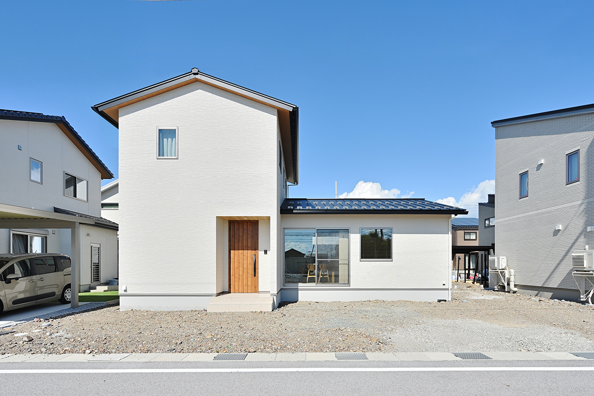 広い敷地にゆったりと建つM様邸は、平屋と2階建てを組み合わせたシンプルモダンな仕上がりです。
