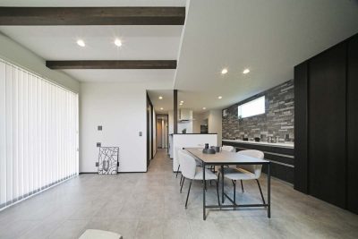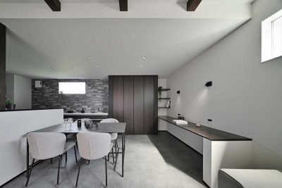 リビング顕し梁のリズムと大きな窓が広がり、毎日が特別になる居心地をつくります。キッチンは手元を腰壁で隠すことで、リビングからの見た目をすっきりと整えました。背面には石目調のアクセントクロスを採用し、空間全体を引き締める落ち着いた雰囲気に。家事をしながらリビングやダイニングに目が届く設計で、家族とのつながりも感じられるキッチンです。