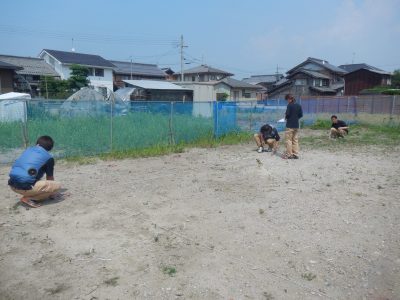 ↓ 7月上旬には着工前の準備で、杭芯出しに