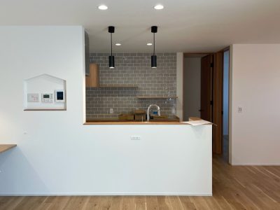 キッチンはコンロ部に壁を設け、対面部も手元が程よく隠れる壁高としました。