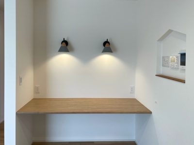 リビング学習コーナーのカウンターは、教科書を置いても手前にノートを広げることができるように奥行きをしっかり取りました。