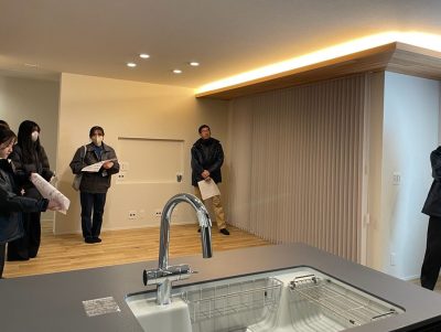 上棟の日から約2ヵ月半、社内検査が行われました。 社内検査では、現場に関わった者だけでなくいろんな立場のスタッフが参加して細かいところまで確認します。 この後、お施主様にもお立会いいただいて年内にはお引き渡しの予定です。