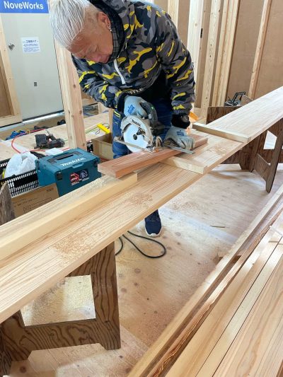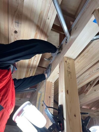 下地打ち中。ビスが打てるように柱の間に木材を入れます。