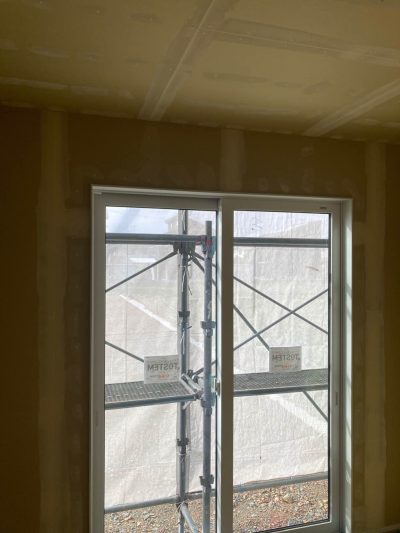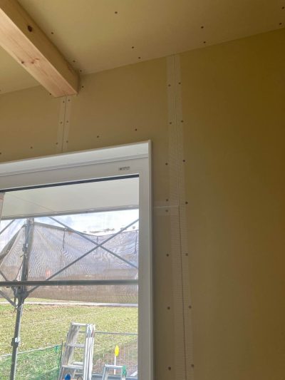 クロスを貼る前にボードのジョイント部分やビスにパテ処理を施します。