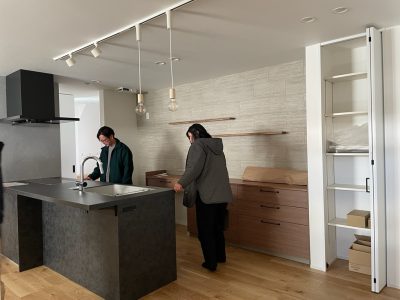 こんにちは、NoveWorks設計の秀平です。 米原市で建築中のS様邸、社内検査に行ってきました。 キッチンを確認するスタッフ。真剣です。 こちらのお住まいでは、キッチンとカップボードで別の色をご採用いただきました。 キッチンだけを黒にすることで、やわらかい印象を残した空間になりました。