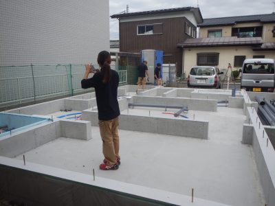 ↓ 基礎が完成して土台の墨出し、レベルチェックに伺いました。