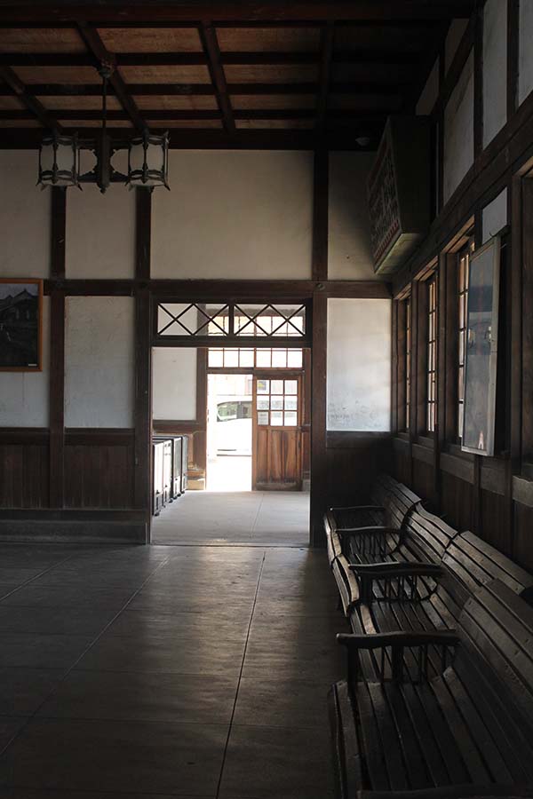 飴色に磨かれた待合室のベンチ。大正ロマンの気配が漂っています。