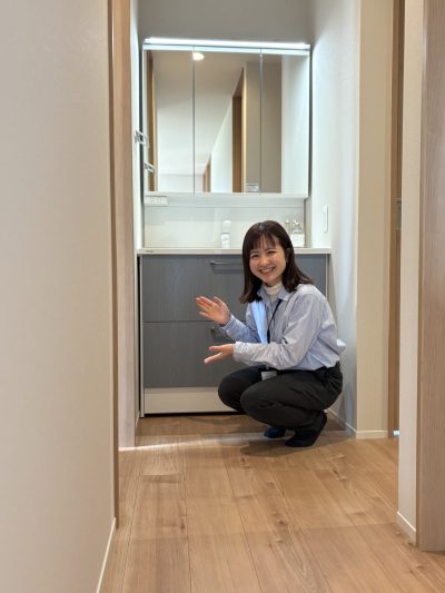 「洗面台と色を揃えて来たんです!」と、ブルーシャツのMさん。