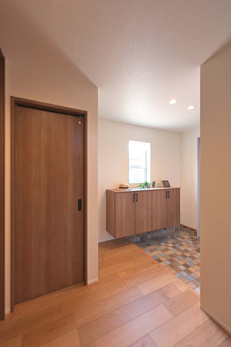 アプローチから敷き詰めたカラータイルは玄関ホールまで続きます。