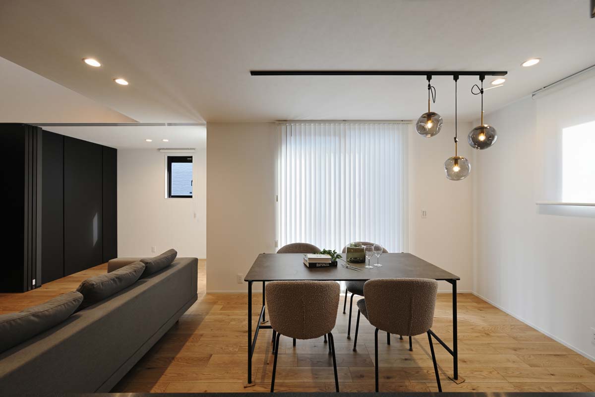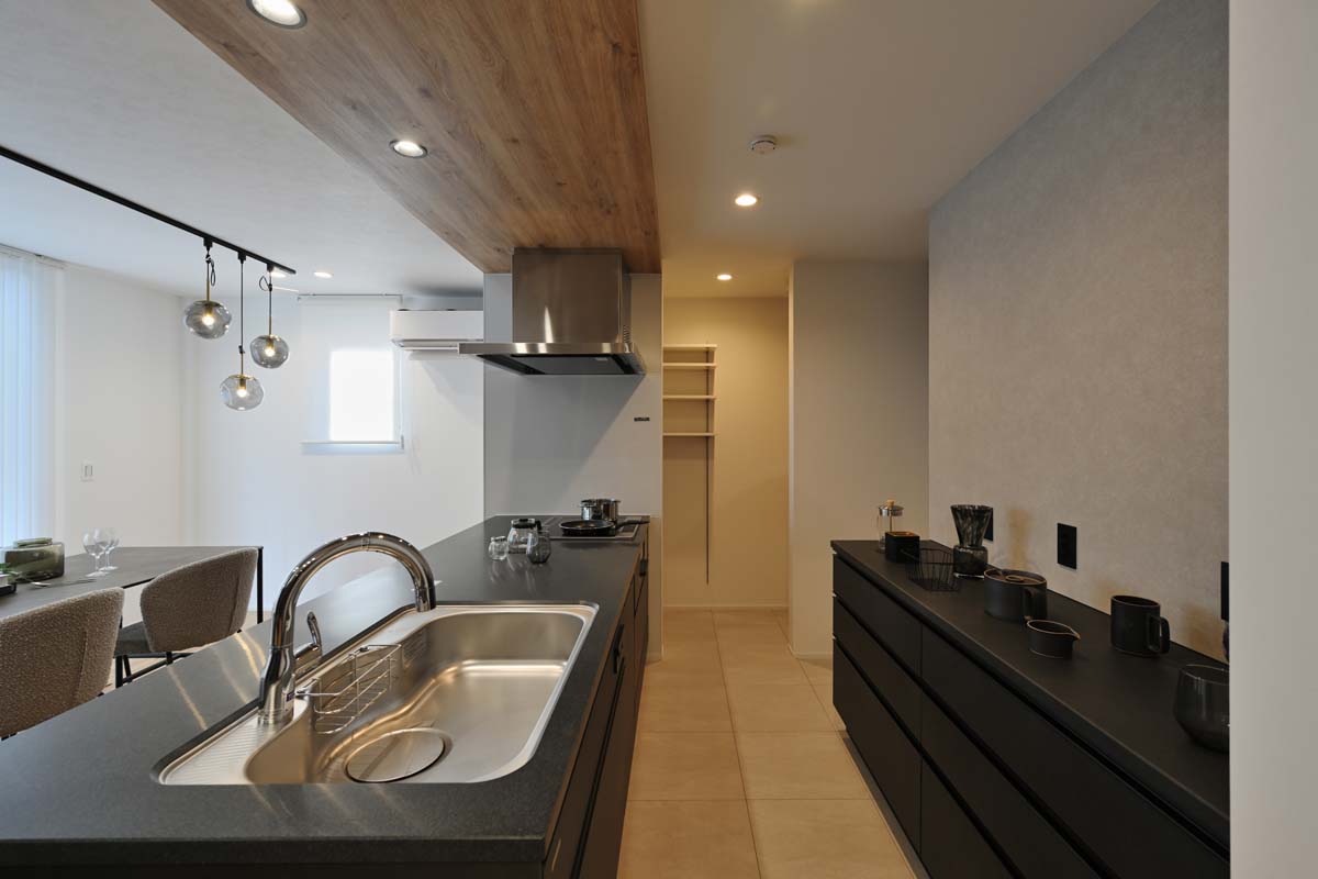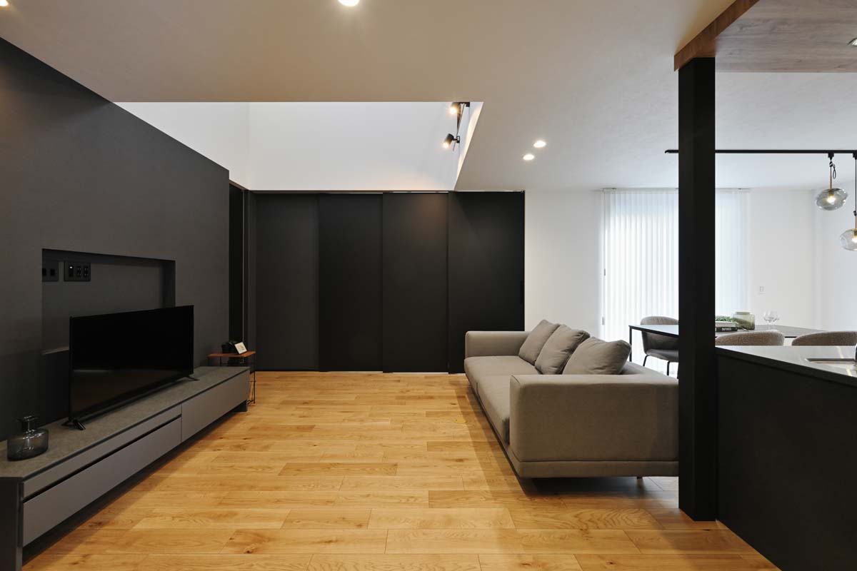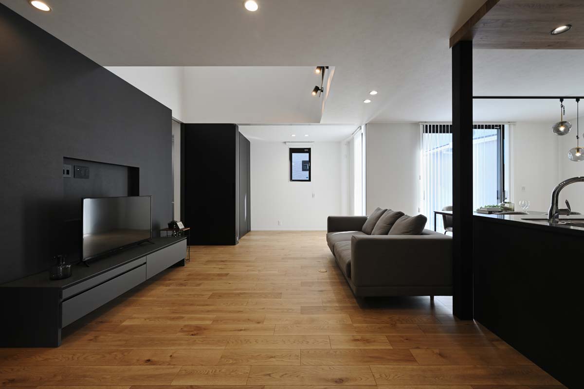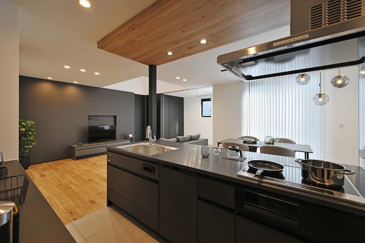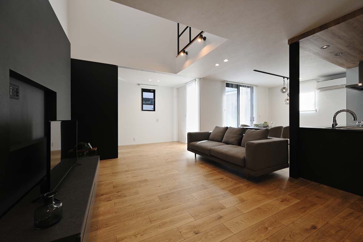 屋内はナラ材の温もりとブラックのアクセントが調和し、シックモダンな雰囲気を演出。リビングの吹き抜けと大きな窓から光を取り込み、明るく開放的な空間が広がります。建具やテレビボードにブラックを取り入れることで、インダストリアルなエッセンスも加わりました。キッチンはブラックで統一し、デザイン性と機能性を兼ね備えた空間に。冷蔵庫や電子レンジなどの家電を壁の裏に隠す工夫を施し、生活感を抑えたすっきりとした仕上がりとなっています。