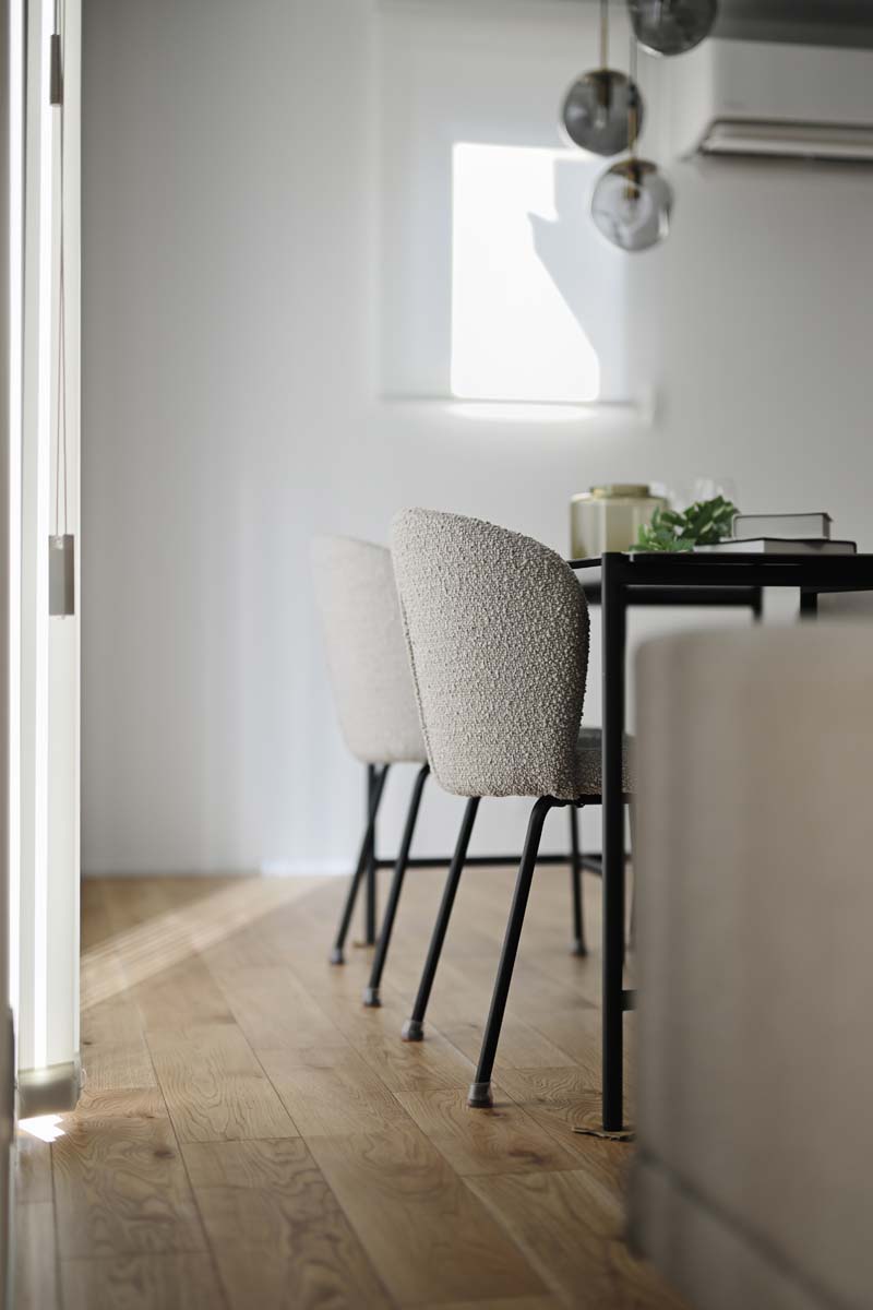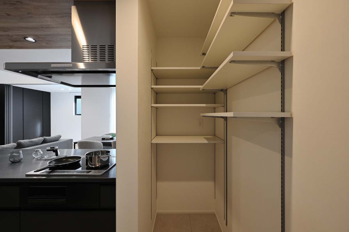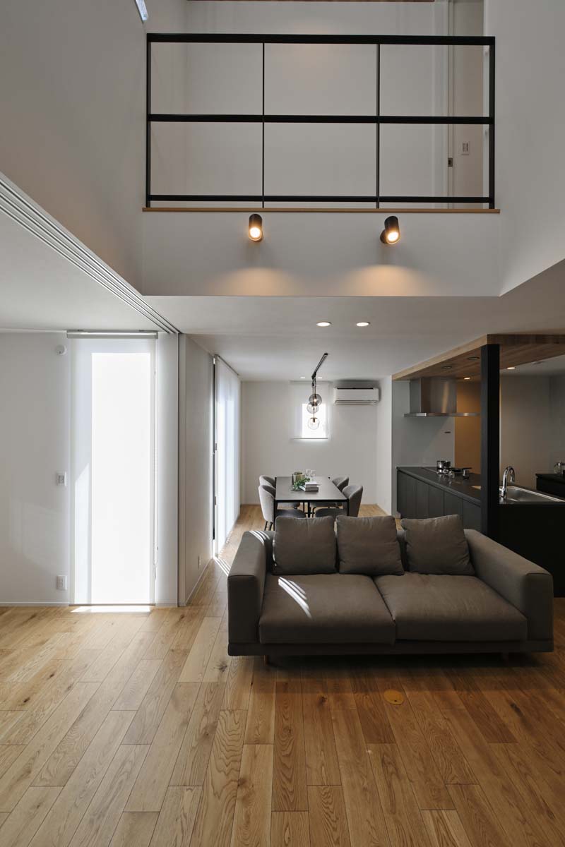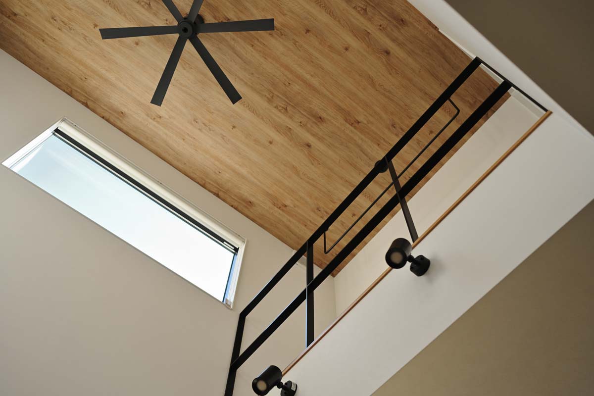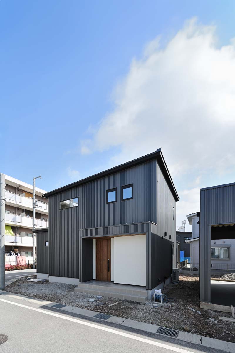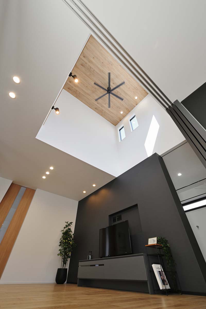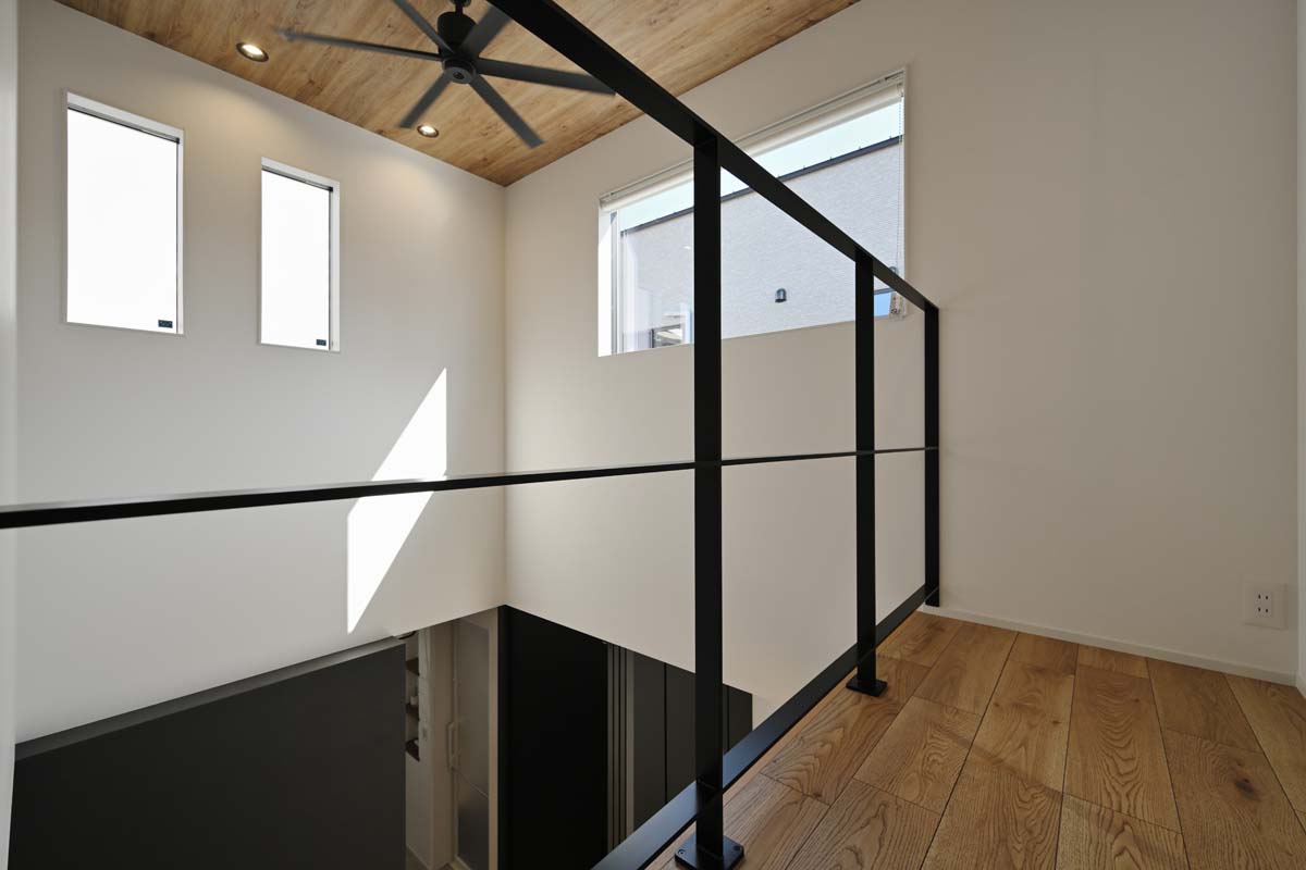 屋内はナラ材の温もりとブラックのアクセントが調和し、シックモダンな雰囲気を演出。リビングの吹き抜けと大きな窓から光を取り込み、明るく開放的な空間が広がります。建具やテレビボードにブラックを取り入れることで、インダストリアルなエッセンスも加わりました。キッチンはブラックで統一し、デザイン性と機能性を兼ね備えた空間に。冷蔵庫や電子レンジなどの家電を壁の裏に隠す工夫を施し、生活感を抑えたすっきりとした仕上がりとなっています。