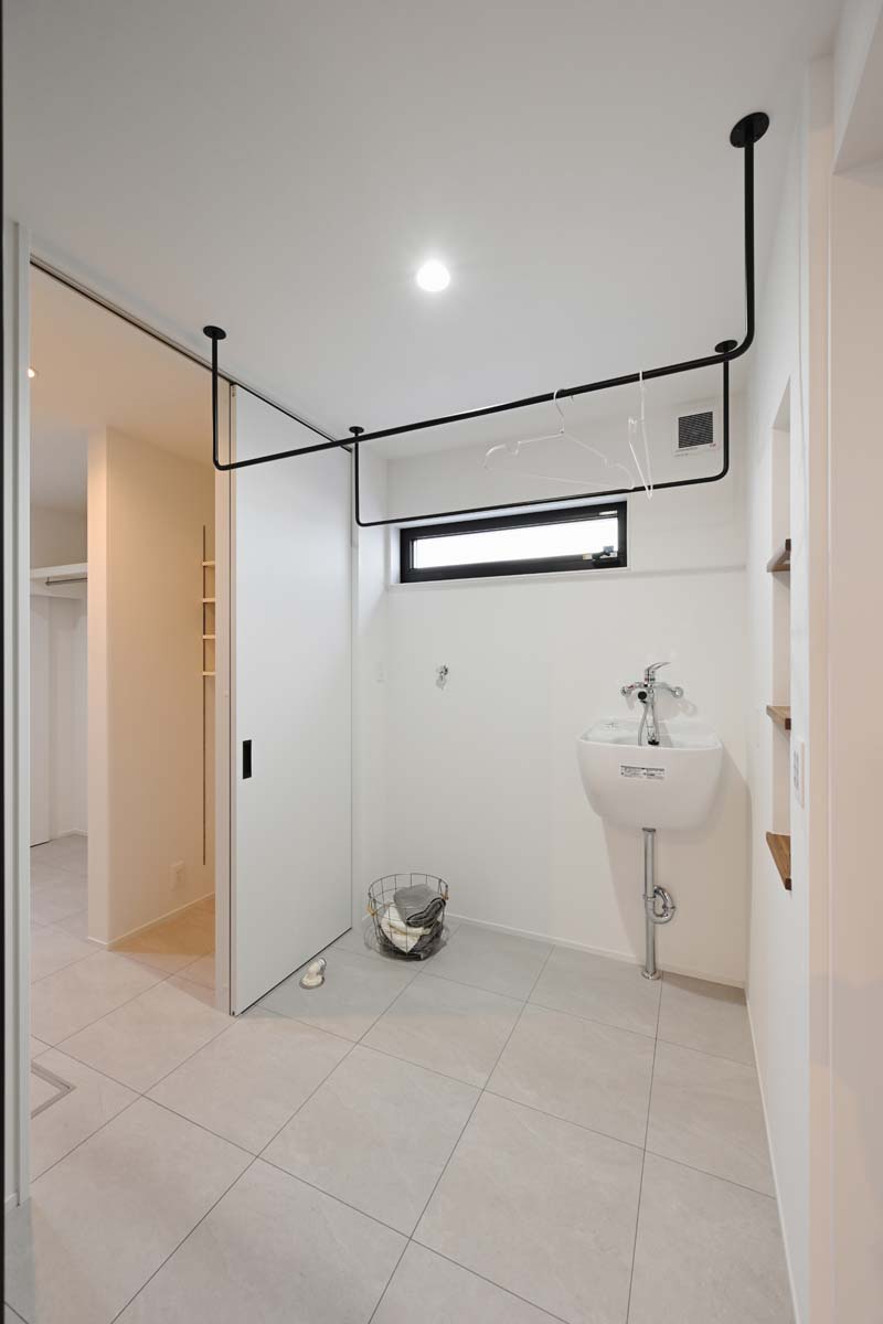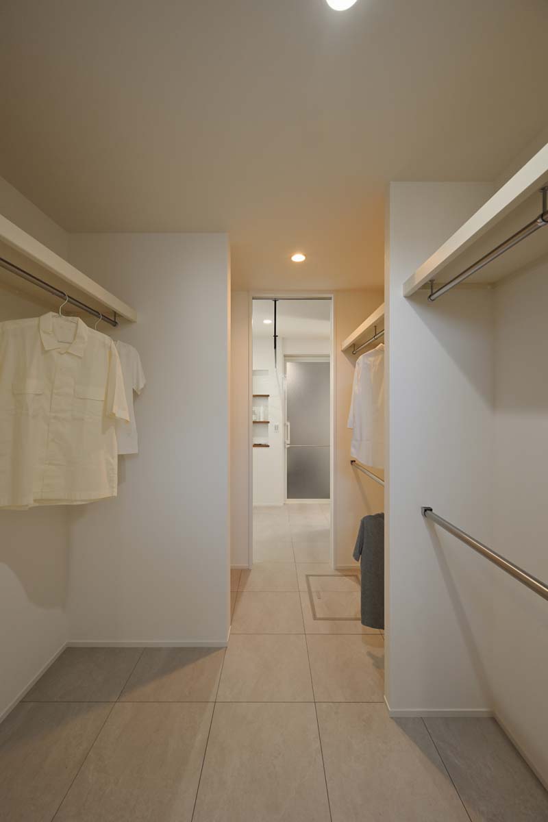 キッチンを中心に回遊動線を採用し、家の中の移動がスムーズに行える間取りとしました。玄関の土間収納とパントリーをつなげることで、買い物帰りの片付けもラクに。洗面室やランドリースペースも広く確保し、室内物干しで天候に左右されない洗濯が可能です。収納も大容量に設計し、すっきりと片付いた暮らしが叶います。