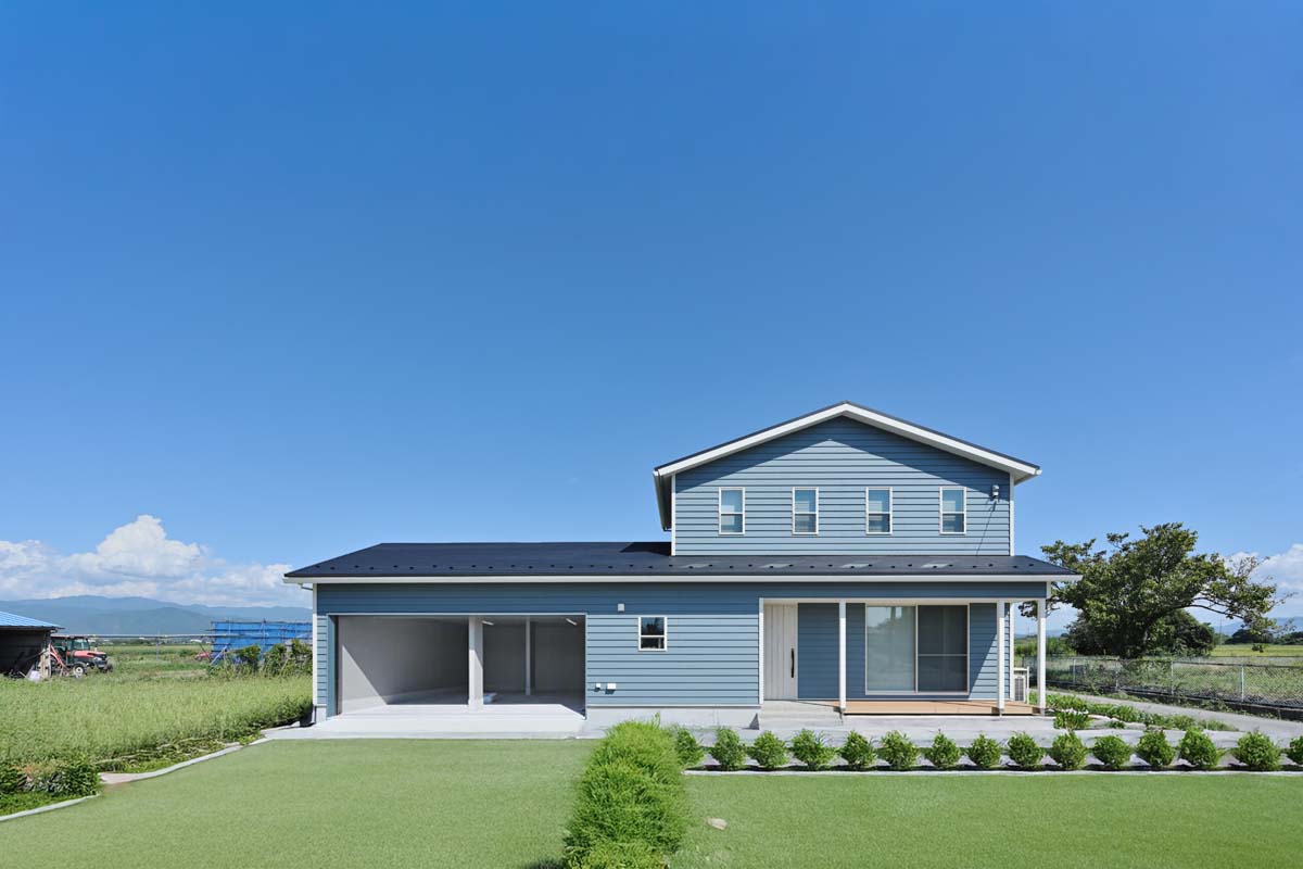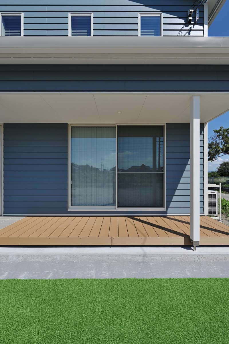 白い窓枠とカバードポーチ、さらにウッドデッキのナチュラルな質感が加わり、青空に映える爽やかな住まいです。
