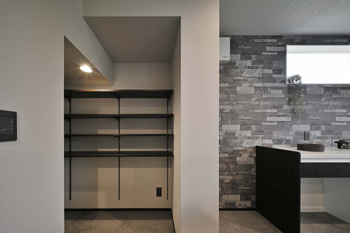 キッチンの奥にはオープン棚のパントリーを設けました。