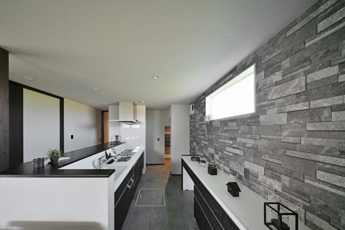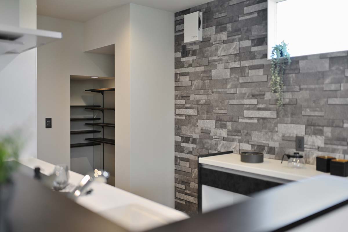 石目調クロスがアクセントとなり、上質で落ち着きのある空間を演出しています。